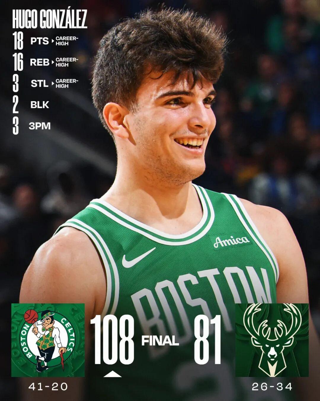 这场比赛,杰伦布朗缺席,新秀雨果-冈萨雷斯顶上了首发,然后打出了生涯之夜:全场出战35分钟,投篮15中7,三分8中3,罚球3中1,得到18分16篮板3抢断2盖帽1助攻。